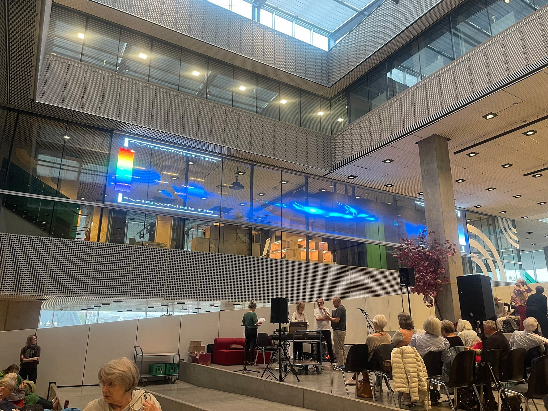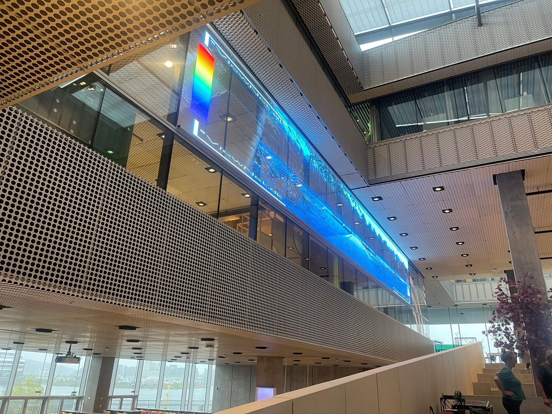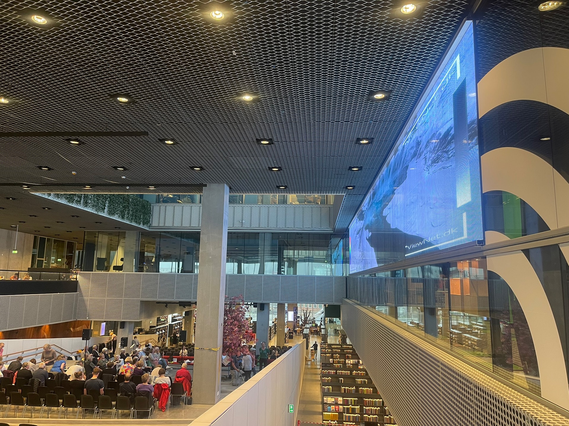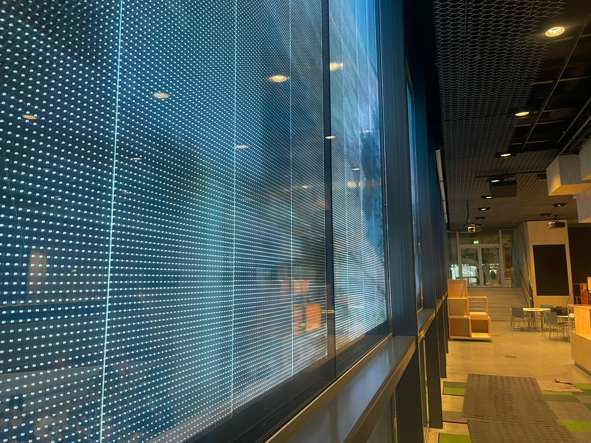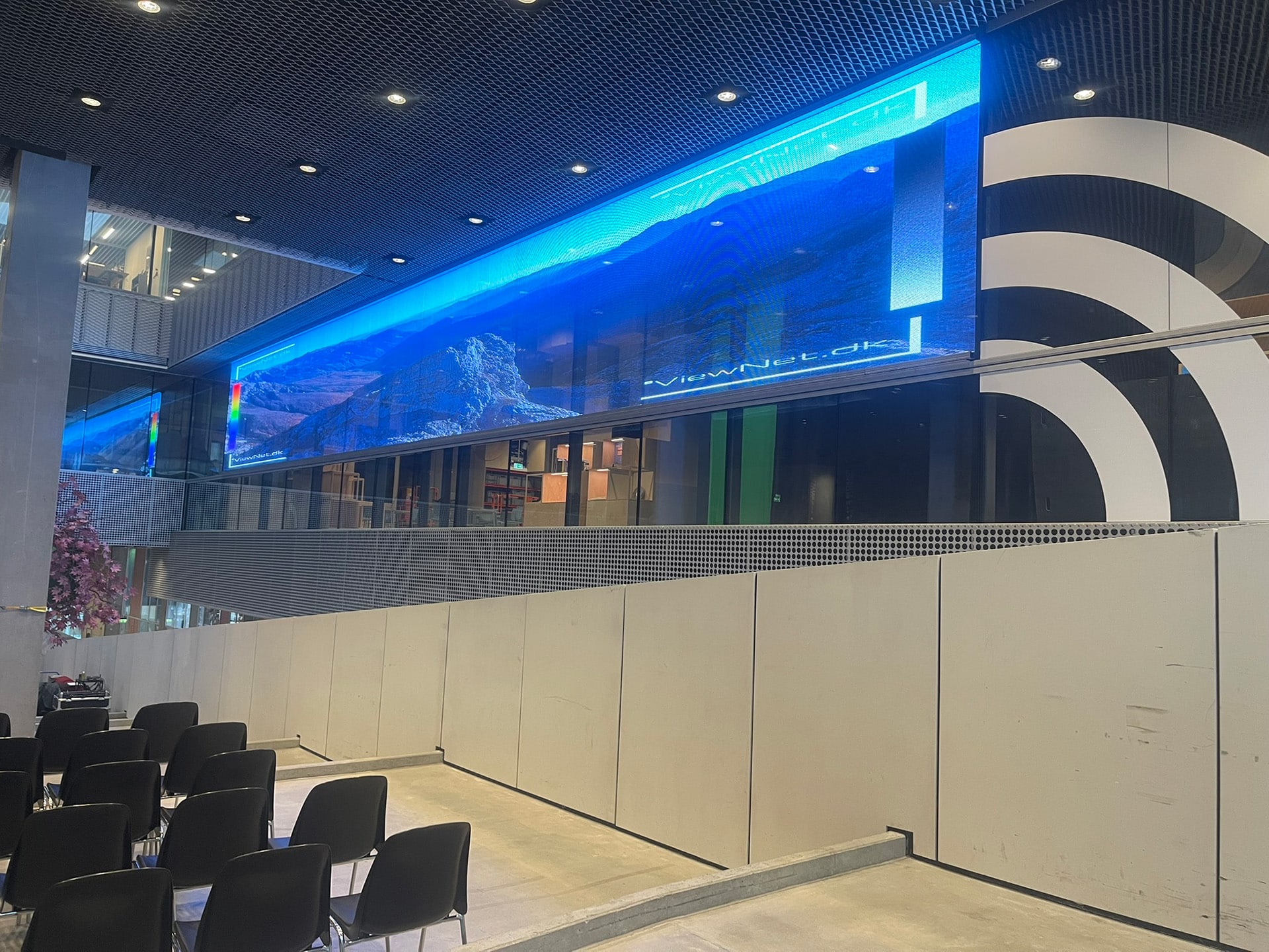 ViewNet har leveret og monteret en beundringsværdig 21 meter transparent LED storskærm, der smukt følger glaspartiet. Takket være den transparente ViewFoil glas teknologi, som gør det muligt at se igennem, vækker storskærmen nysgerrighed og skaber en levende oplevelse for kulturhusets daglige gæster.